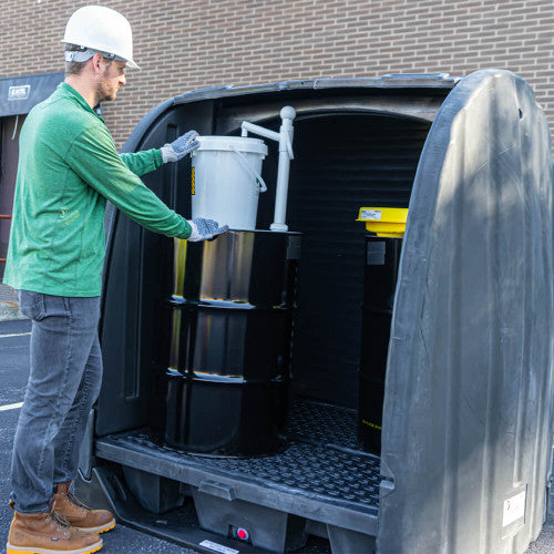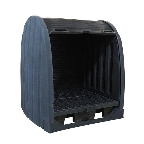 Store your drums indoors or outdoors with Black Diamond spill containment drum sheds.
