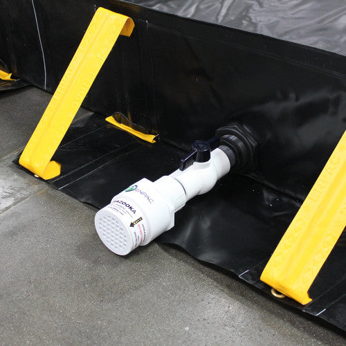 Rainwater intrusion can be a costly nuisance when it comes to outdoor containment options. The BAZOOKA is both a trickle filter and automatic shut off valve using filter media technology to capture and contain oils and fuels while letting clean water pass through.