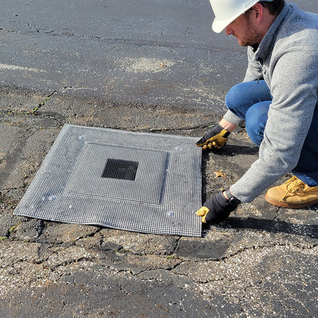 Grate Guardian with Oil Absorbing Spilltration technology is specifically designed to remove oily sheen from storm water, while also preventing sediment & debris. Simply position the magnetic Grate Guardian in the desired location on the grate and let the magnets do the work. Once installed, water passes through while oil is instantly absorbed and sediment is stopped in its tracks. Unlike inserts, the sediment and debris is captured before it enters the catch basin, making it easier to clean and maintain. The raised middle overflow port prevents ponding in high flow situations, while the industrial mesh top cover protects against damage from vehicle traffic. The Grate Guardian with Spilltration technology is the premium solution for above grate storm water and oil filtration.