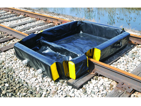 The Stinger Rail Berm is designed to provide portable spill containment. Simply place the spill berm under the valves of a rail tank car, with part of the sump going over the rail, to capture any possibility of leaks during loading and unloading.